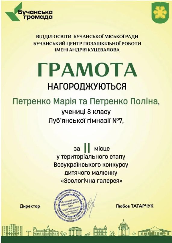 • Петренко Марія та Петренко Поліна, учениці 8 класу Луб’янської гімназії №7, за роботу «Небезпечний звір. Африканський велетень».